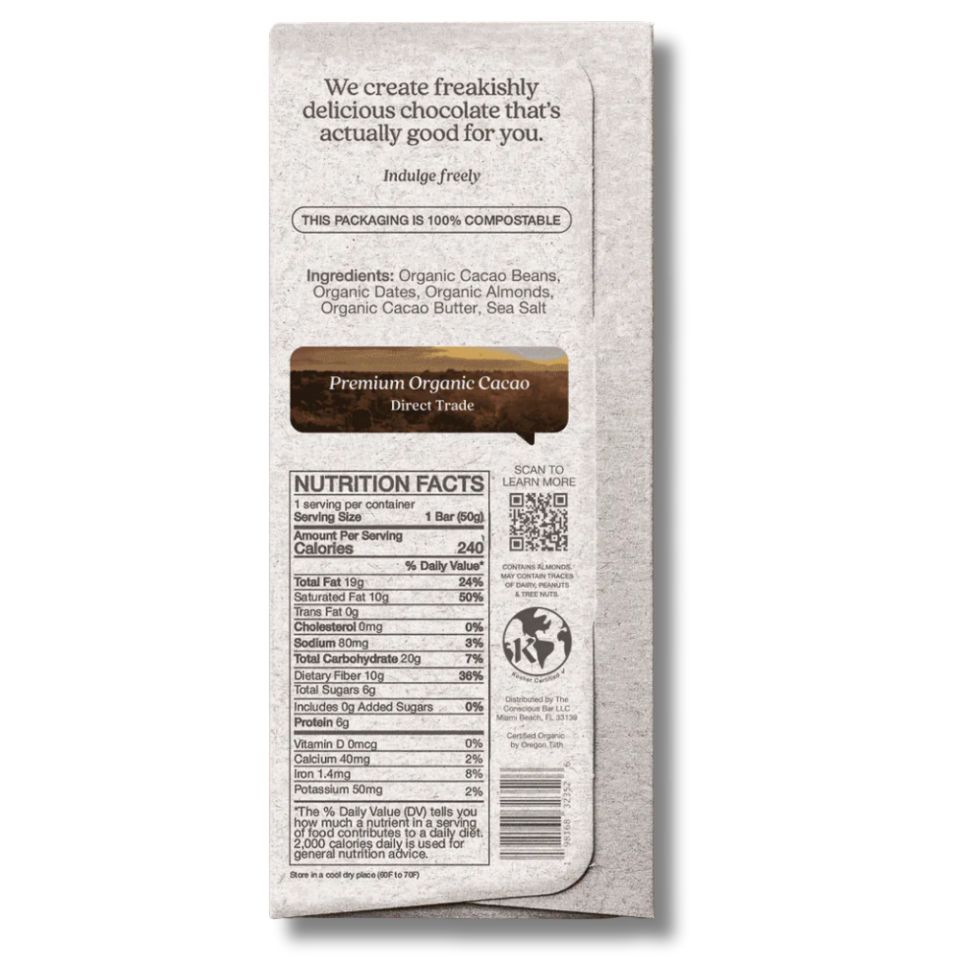 A gentle crunch, a subtle dance of sea salt, and a generous serving of delicately roasted almonds makes this bar the perfect sweet & savory experience. Each square delivers a satisfying bite of rich, smooth chocolate, small and plentiful crunches of toasted almonds and a hint of fine sea salt. [Product description written by The Conscious Bar]