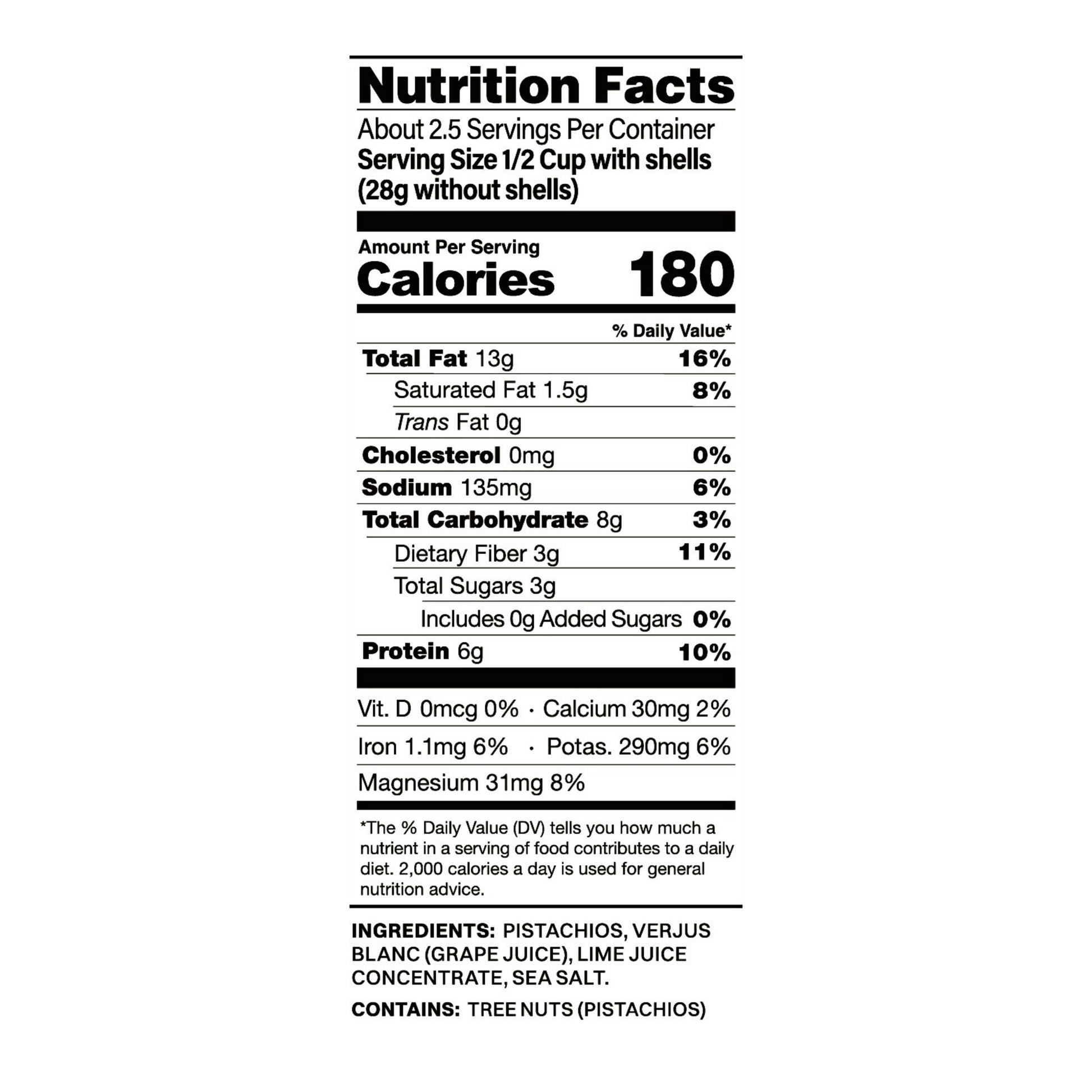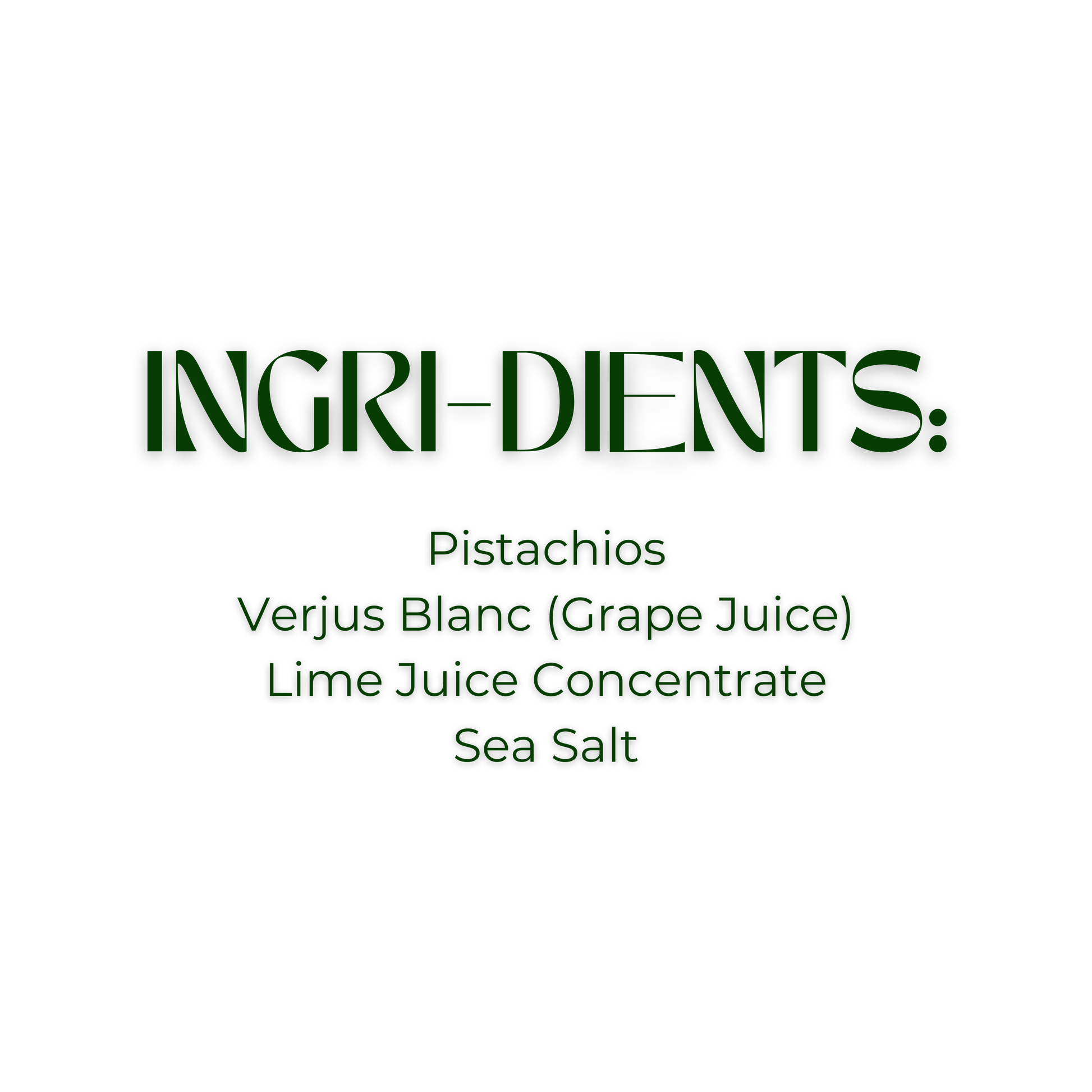 Pistachios, Joon sources large, high-quality non-GMO pistachios from California’s Central Valley, which is home to some of the world’s best pistachio growers. Instead of coating nuts in powders or oils, Joon's specialized cooking method infuses flavor, resulting in creamy, crunchy, flavorful pistachios that are consistently large and easy to open. Verjus Blanc (Grape Juice), Lime Juice Concentrate Joon's lime juice concentrate is a single‑ingredient, 100% lime juice concentrate produced by extracting juice from fresh limes and thermally concentrating the juice through controlled water reduction. No preservatives or additives are added in this process. , Sea Salt; Contains Tree Nuts.