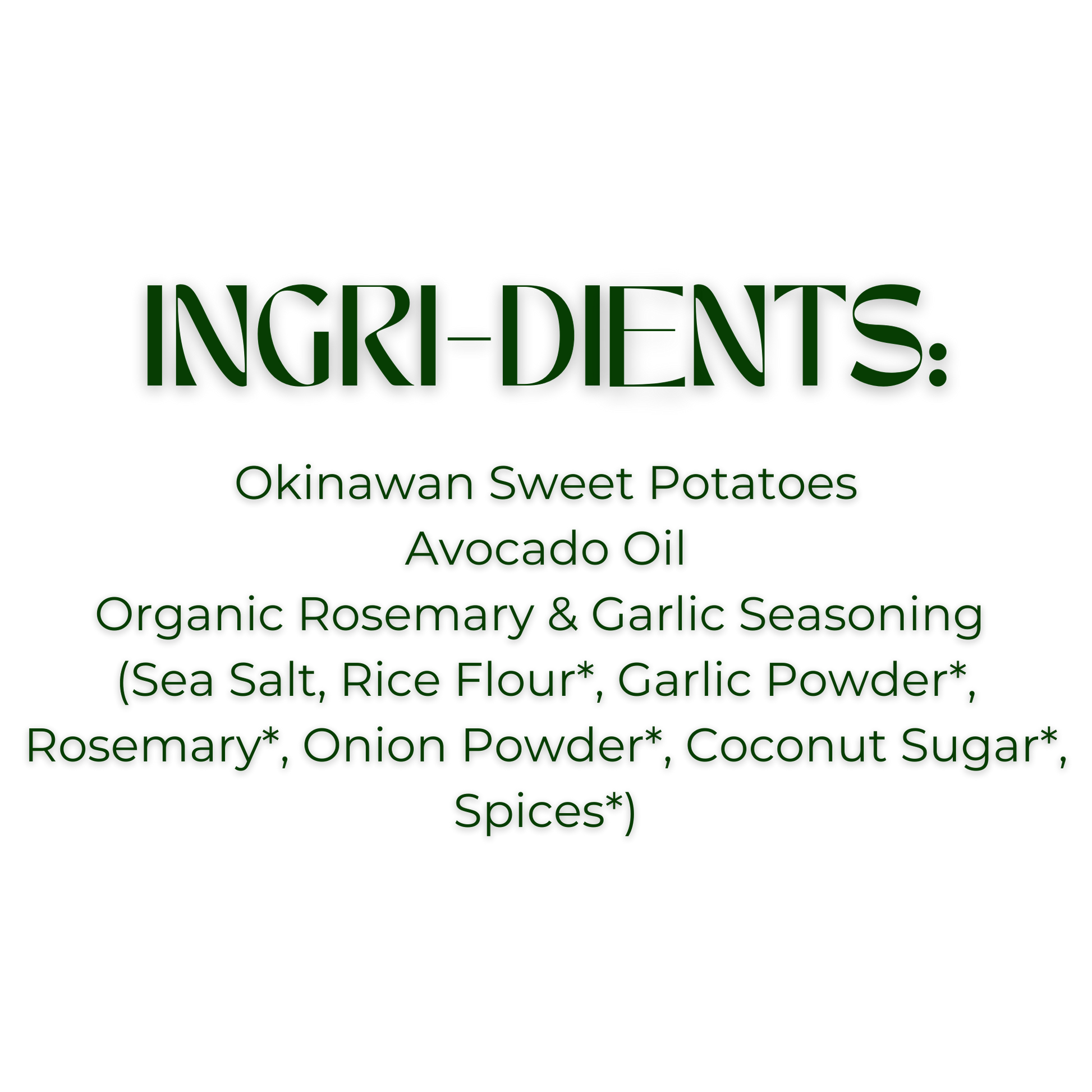 Okinawan Sweet Potato Enso's sweet potatoes are sourced directly from family-owned farms in the South Pacific. The farms use non-GMO farming practices, and the sweet potatoes are washed and kettle cooked, never sprayed with any hidden additives during processing. , Avocado Oil Enso uses 100% avocado oil that is cold-pressed, refined, and non-GMO verified. , Organic Rosemary & Garlic Seasoning ( Sea Salt Enso's sea salt is kosher. , Rice Flour*, Garlic Powder* Rosemary*, Onion Powder*, Coconut Sugar*, Spices Rosemary and Black Pepper *)